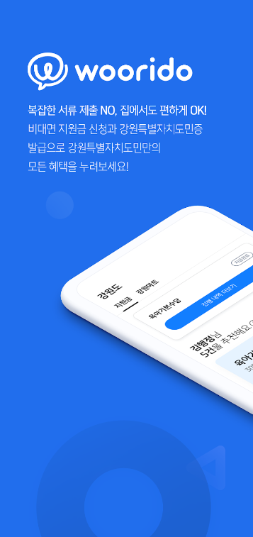 우리도 어플은 강원특별자치도민의 생활에 도움이 될 다양한 서비스를 하나로 제공해 주는 통합 플랫폼으로 복잡한 절차없이 간편하게 도민 인증을 받아 육아기본수당, 농업인 수당 신청 등을 비대면으로 쉽고 빠르게 이용할 수 있습니다. 아래에서 바로 우리 어플 다운로드 받으시고 서비스 신청하시기 바랍니다.