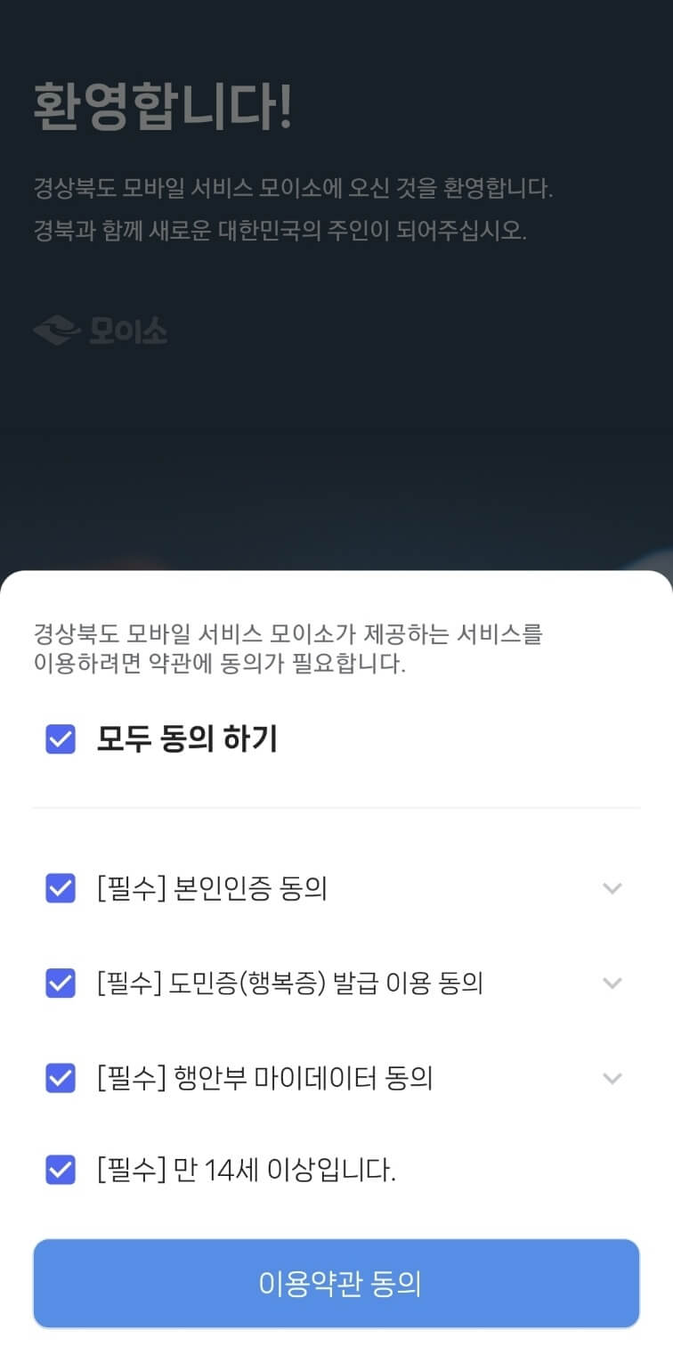 모이서 어플은 경상북도 마이데이터 플랫폼 서비스로 행정안전부 마이데이터를 이용하여 안전하게 간편하게 도민증을 발급받아 농어민수당 신청 등 비대면 행정서비스를 간편하게 이용할 수 있습니다. 아래에서 바로 모이소 어플 다운로드 받으시고 서비스 신청하시기 바랍니다.