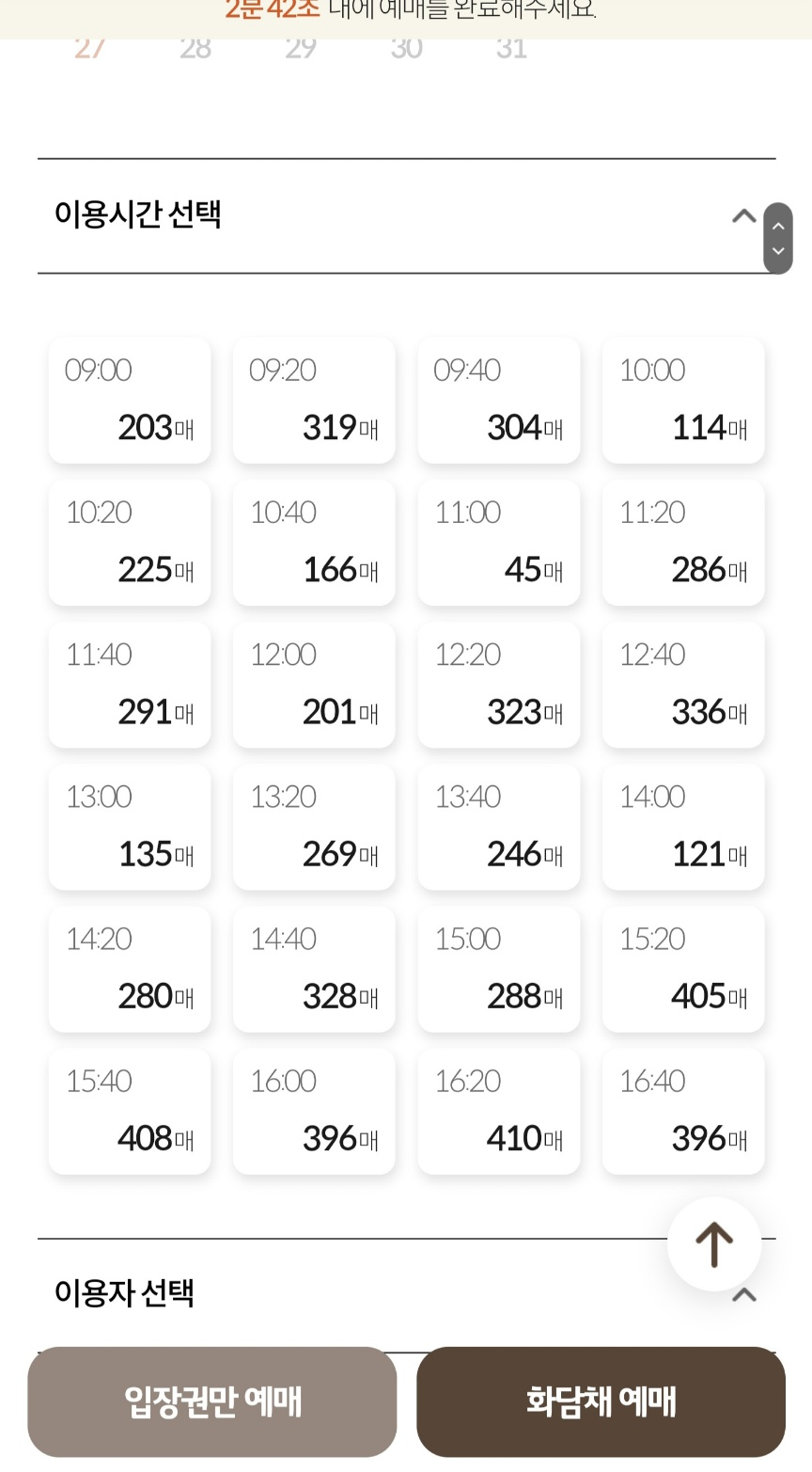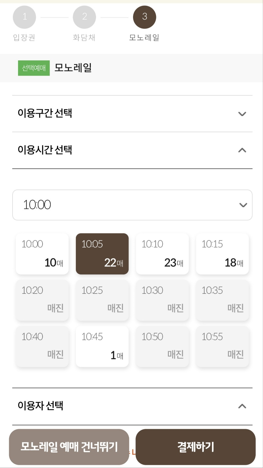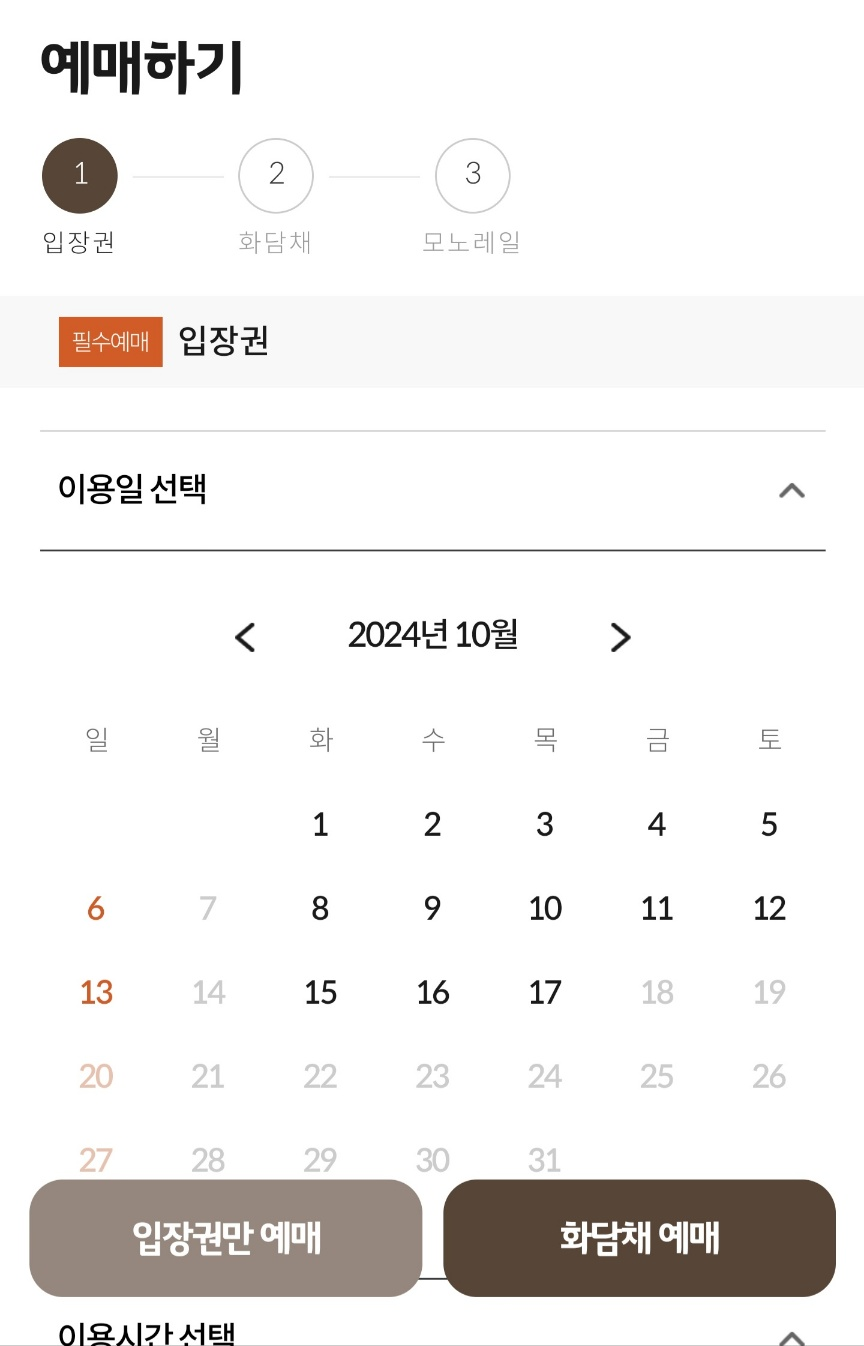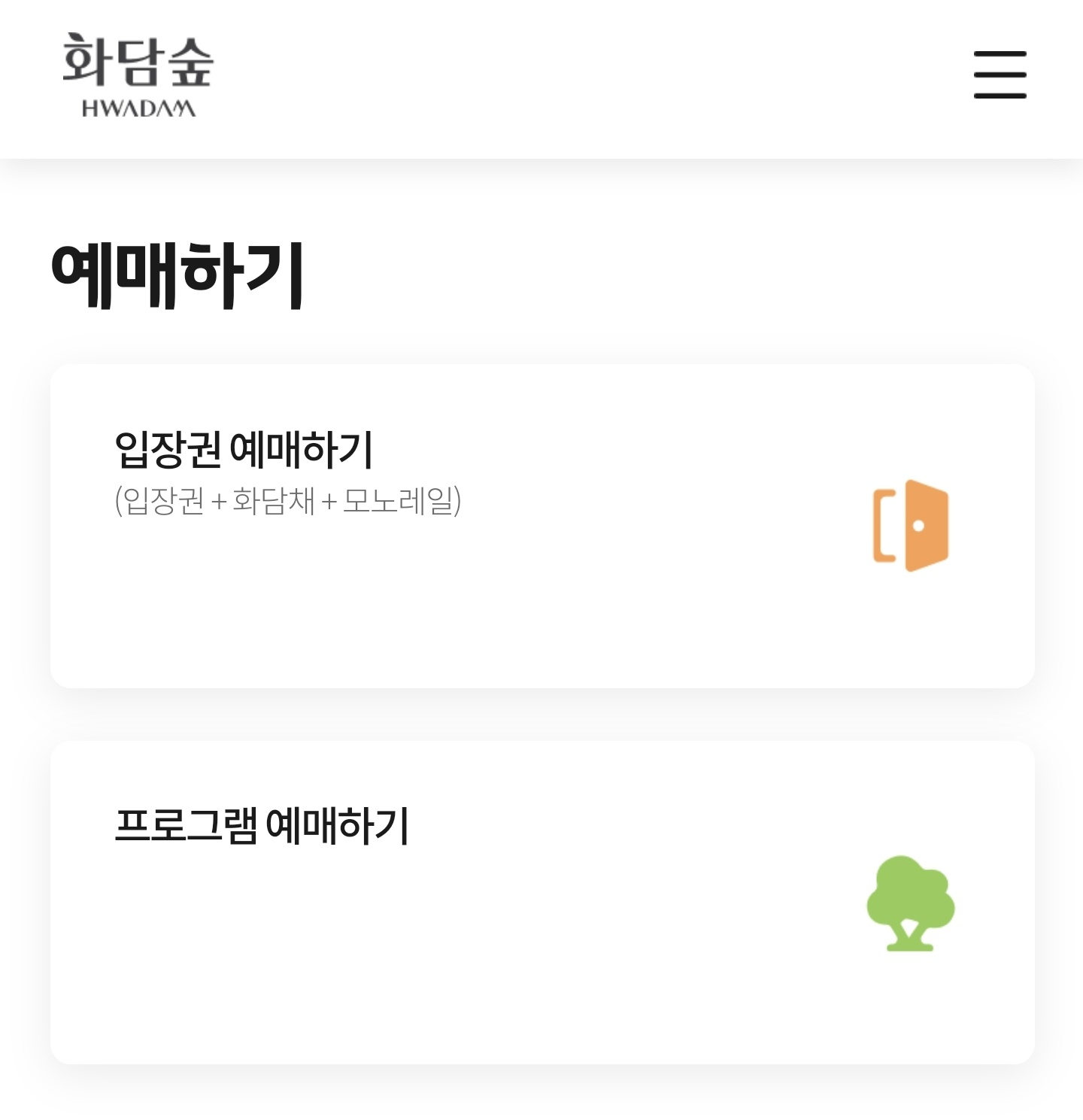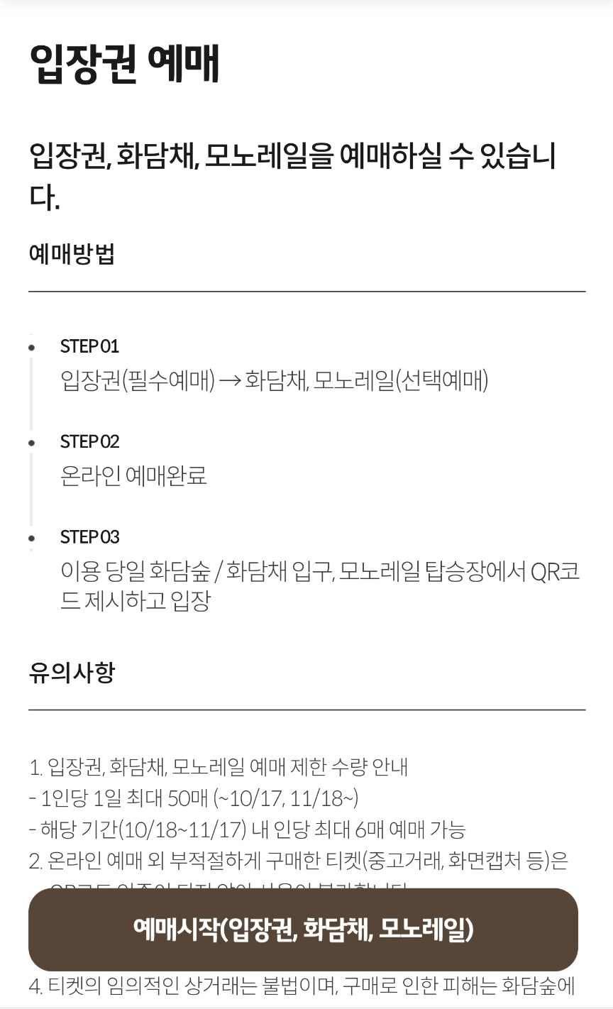 - 예매 시작 전 입장권만 구입할지 화담채, 모노레일 함께 구입할 지 미리 결정 후 진행하세요.