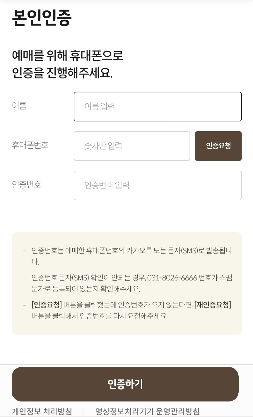 3. 이름, 휴대전화번호 입력 후 인증버튼 누르면 카톡으로 인증번호가 옵니다. 인증번호 입력 후 인증하기 눌러주세요