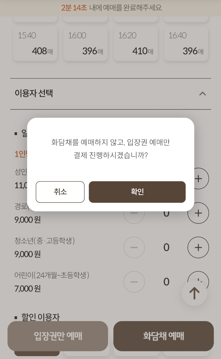 6. 입장권만 예매할 경우 입장권만 예매 선택하면 되며 선택 시 경고문구가 뜬 후 확인 누르면 계속 진행되며, 화담채 예매를 함께 진행하는 경우 화담채 예매를 누르면 화담채 예매까지 함께 이어집니다. 화담채 예매를 선택하여도 화담채 예매 건너뛰기 후 모노레일 선택할 수 있기 때문에 일단 화담채 예매 버튼 누르는 것도 좋습니다.