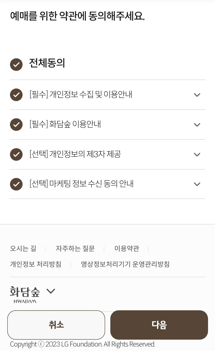 2. 예매 약관 동의해주세요. 전체동의 시 빨리 넘어갈 수 있습니다. 선택 정보 제공의 싫은 경우 필수만 체크하셔도 됩니다.